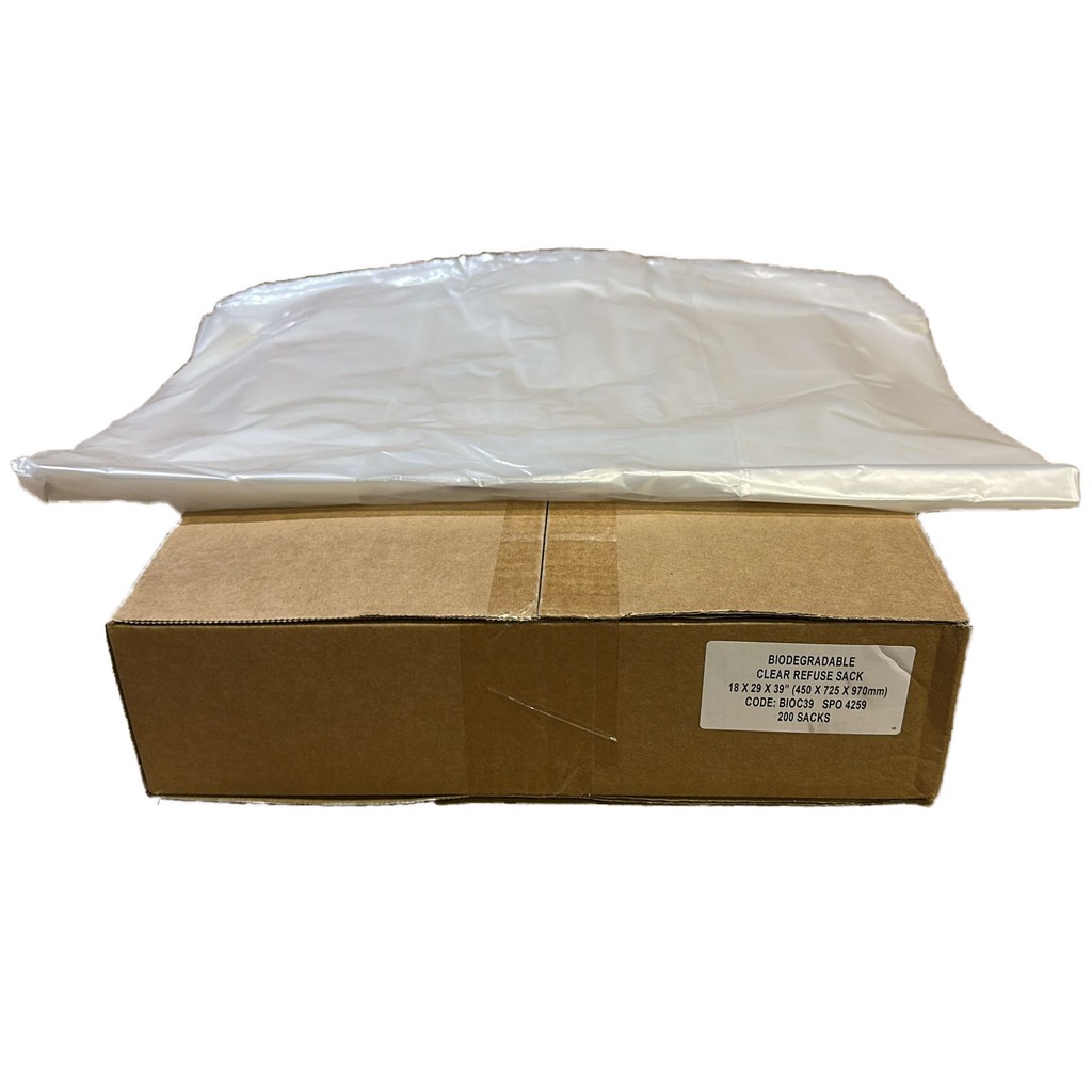 These high quality, Clear Biodegradable Medium Duty Refuse Sacks measure the industry standard of 18 inches (450mm) x 29 inches (725mm) x 39 inches (970mm) when opened.