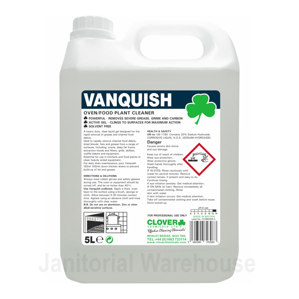 Clover Vanquish is a heavy duty, clear liquid gel designed for the rapid removal of grease and charred food debris.