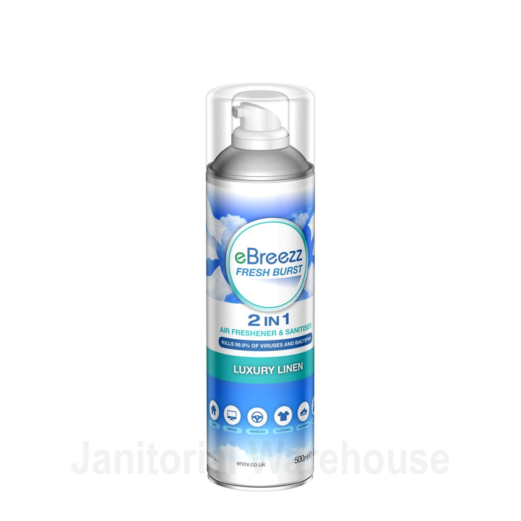 ENOV eBreezz Luxury Linen 2 in 1 Air Freshener & Sanitiser provides a refreshing clean scent with subtle notes of powder and musk, complemented by a white floral fragrance with citrus,