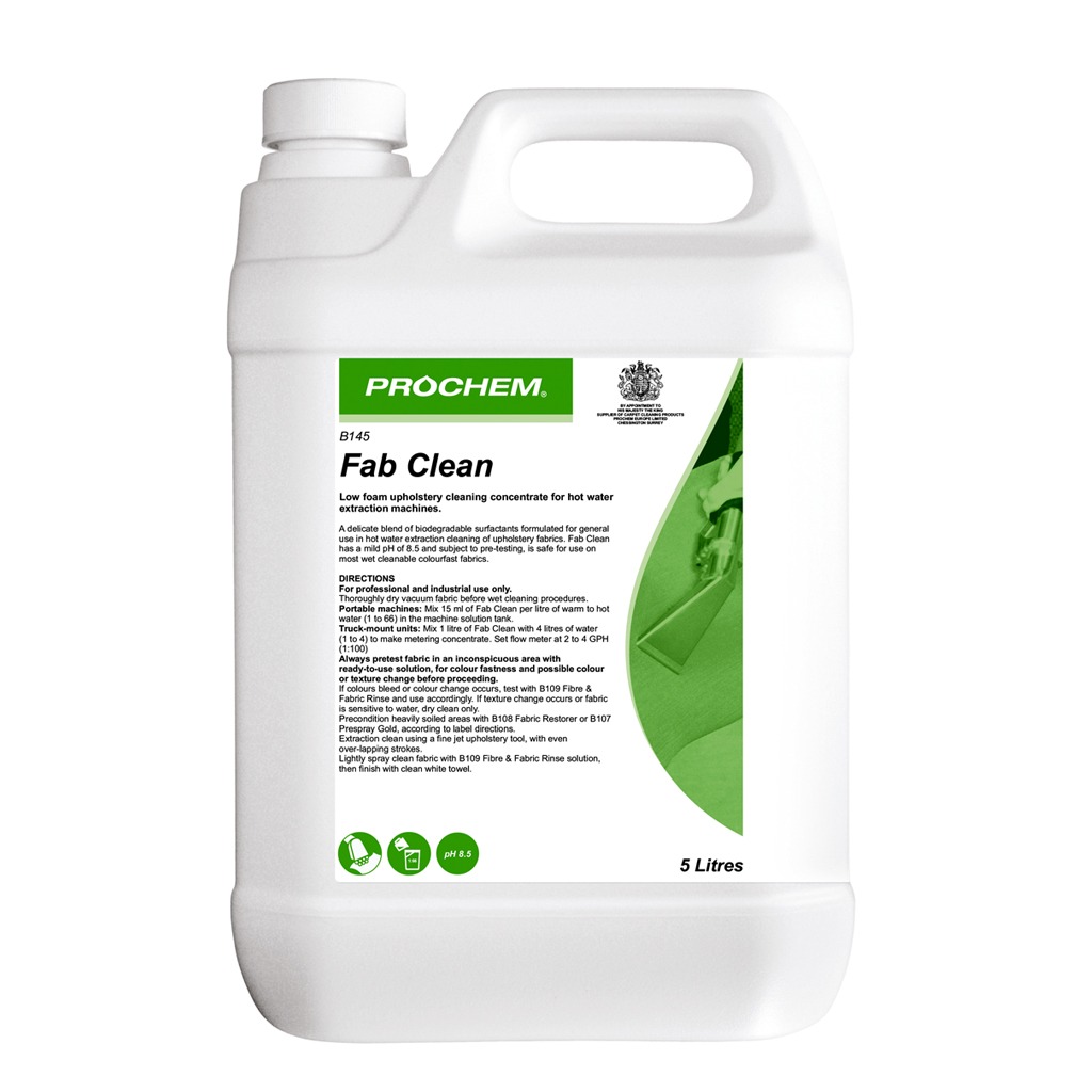 Prochem Fab Clean is a delicate blend of biodegradable surfactants formulated for general use in hot water extraction cleaning of upholstery fabrics.
