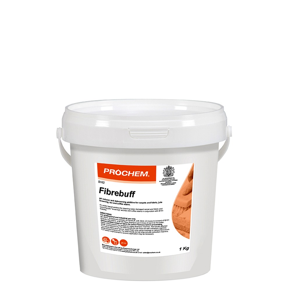 Prochem Fibrebuff is an acidic powder additive for use in combination with B151 Oxibrite and B105 Fibre Shampoo when removing "browning" stains or cleaning water damaged carpet.