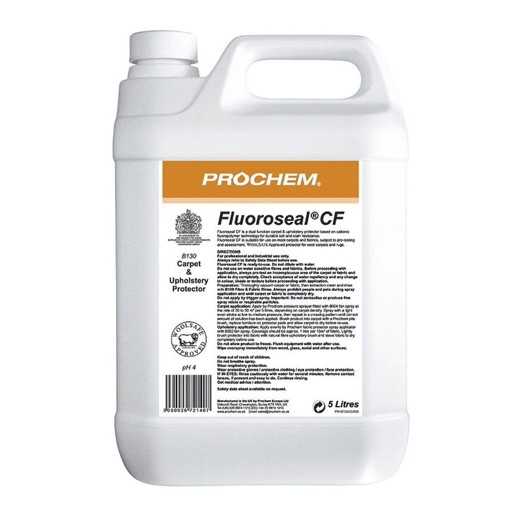 Prochem Fluoroseal CF coats and protects fibres against water and oil based spillages, making carpets and fabrics easier to clean.