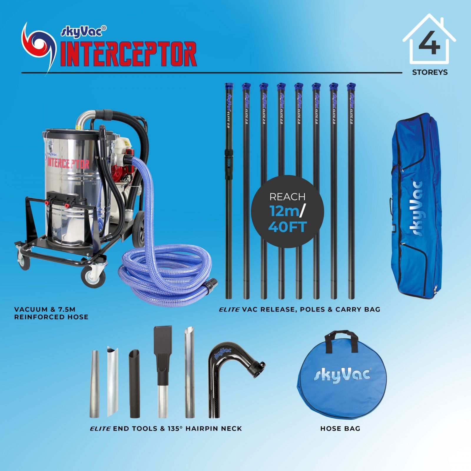 With an extremely powerful vacuum capacity, the Skyvac Interceptor can lift and remove the heaviest of waste matter from gutters up to 40ft from the ground.